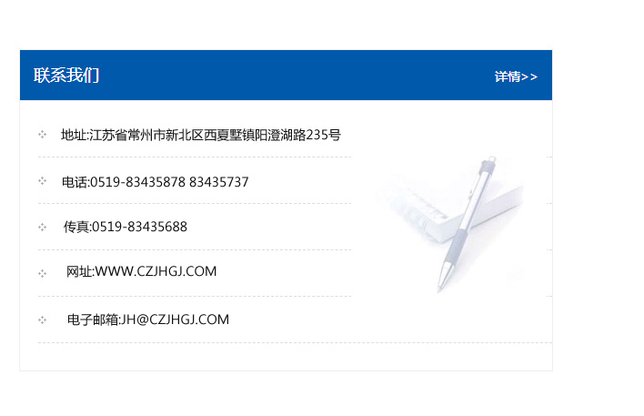 地址:常州市新北區友邦商務大廈1幢16、17層  電話:0519-85101652  傳真:0519-85112595  郵編:213022  網址:www.cz-jiayue_cn.xh10688.com  郵箱:xiajifengaa@163.com